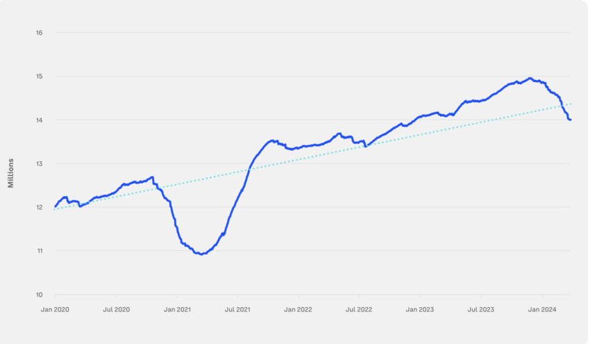 이는 곧 LTH 보유자들이 보유 자산의 일부를 청산하기 시작할 수 있음을 의미합니다. 실제로 2024년 1분기에는 장기 보유자들이 보유한 공급량이 장기 추세선 아래로 떨어졌습니다.