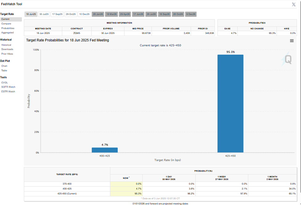 CME 페드워치툴의 데이터에 따르면, 시장은 2025년 6월 18일 FOMC 회의에서 연준이 현재 목표 금리인 4.25-4.50 베이시스 포인트(bps)를 유지할 확률을 95.3%로 가격에 반영하고 있습니다. 한편, 25 bps 인하하여 40.0-4.25 bps로 조정할 확률은 4.7%입니다.