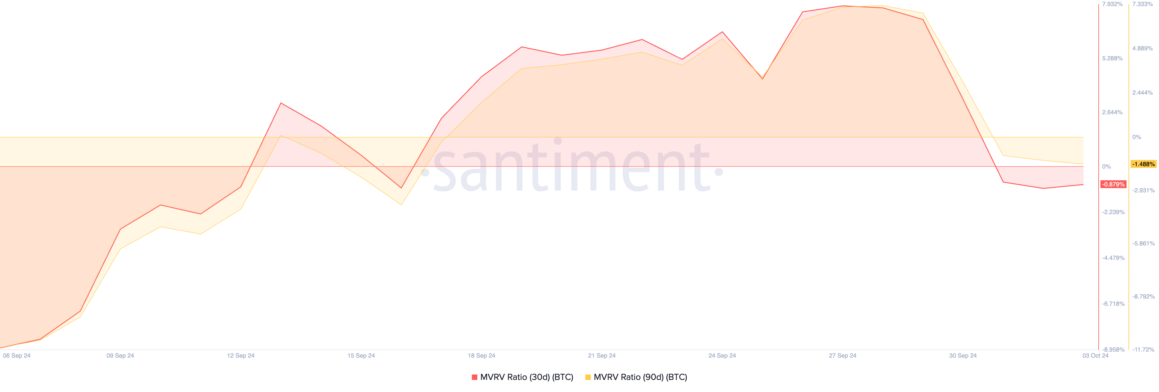 비트코인의 시장 가치 대 실현 가치(MVRV) 비율은 모든 보유자의 전반적인 수익성을 측정하는 온체인 지표입니다. 현재 비트코인의 30일 및 90일 MVRV 비율은 각각 -0.89와 -1.48입니다.