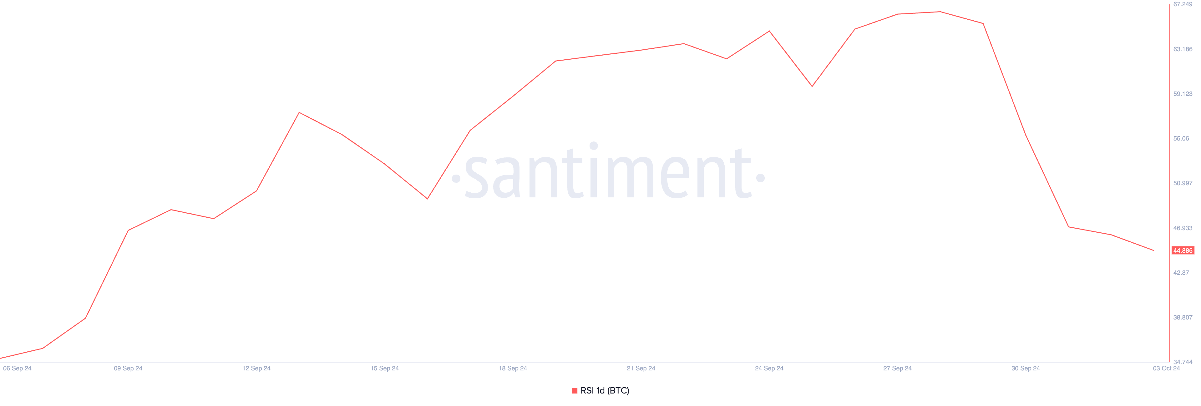 이 매수 신호는 일부 트레이더들이 BTC 보유량을 늘리도록 격려할 수 있지만, 추가 하락의 위험이 여전히 존재한다는 점을 유의해야 합니다. 시장의 매수 압력은 계속해서 하락 추세를 보이며, 현재 BTC의 상대 강도 지수(RSI)는 44.88입니다.