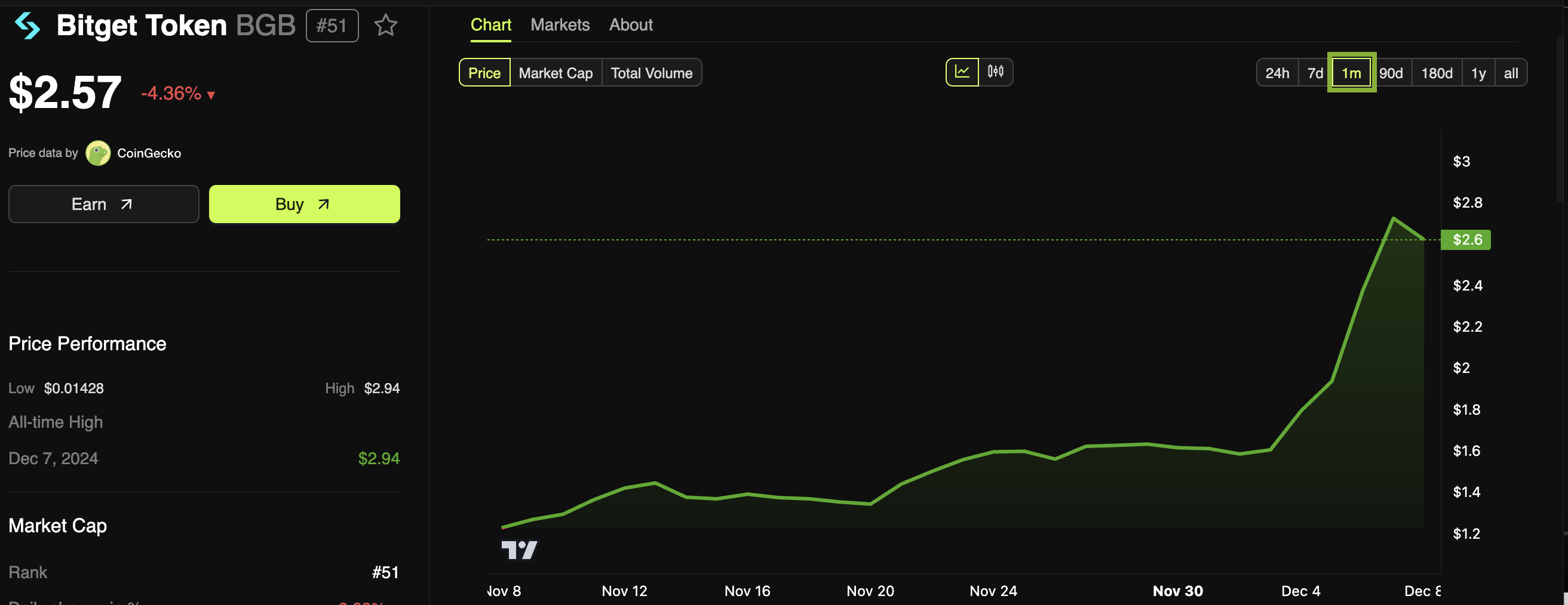 한편, 비트겟은 올해 폭발적인 성장을 이미 경험했습니다, 현재의 강세장은 토큰(BGB)을 더욱 상승시켰습니다. 토큰은 주말 동안 사상 최고치를 기록하며 올해 거의 400% 상승했습니다.