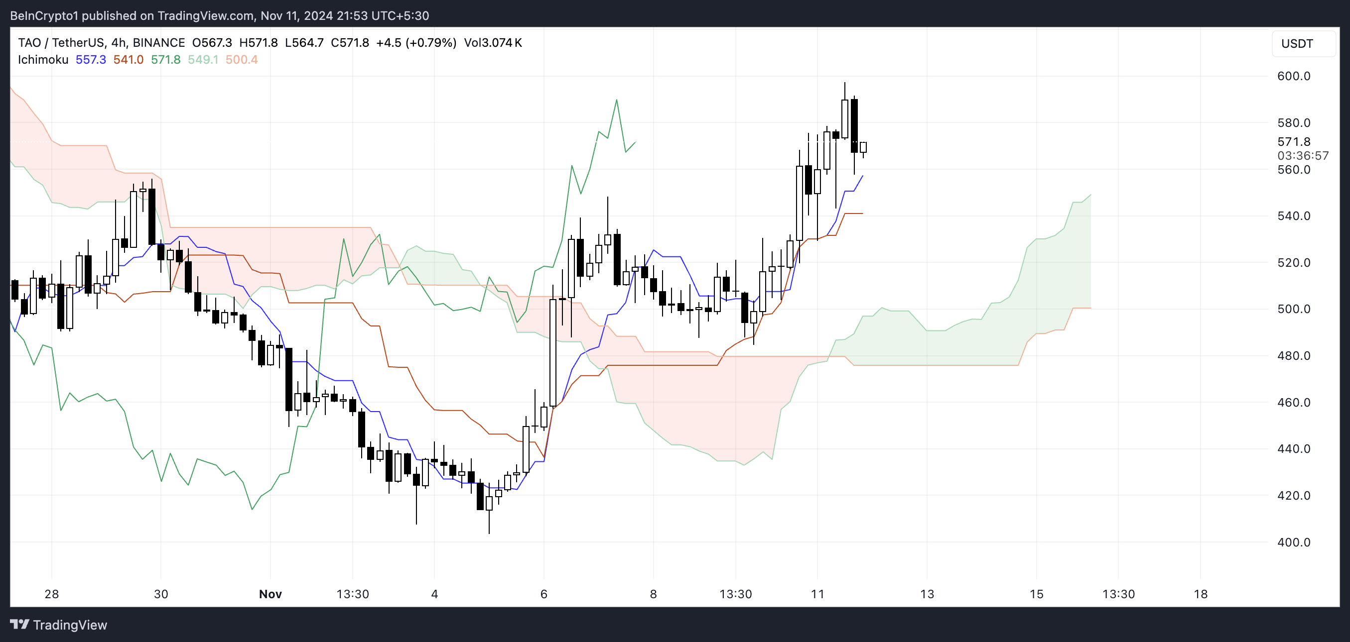 이는 긍정적인 신호로, 구매 관심이 유지되고 있음을 종종 확인합니다. 또한, 선행 스팬 A가 스팬 B 위에 있어 녹색 클라우드를 형성하며 TAO에 대한 긍정적인 감정을 더욱 강화합니다.