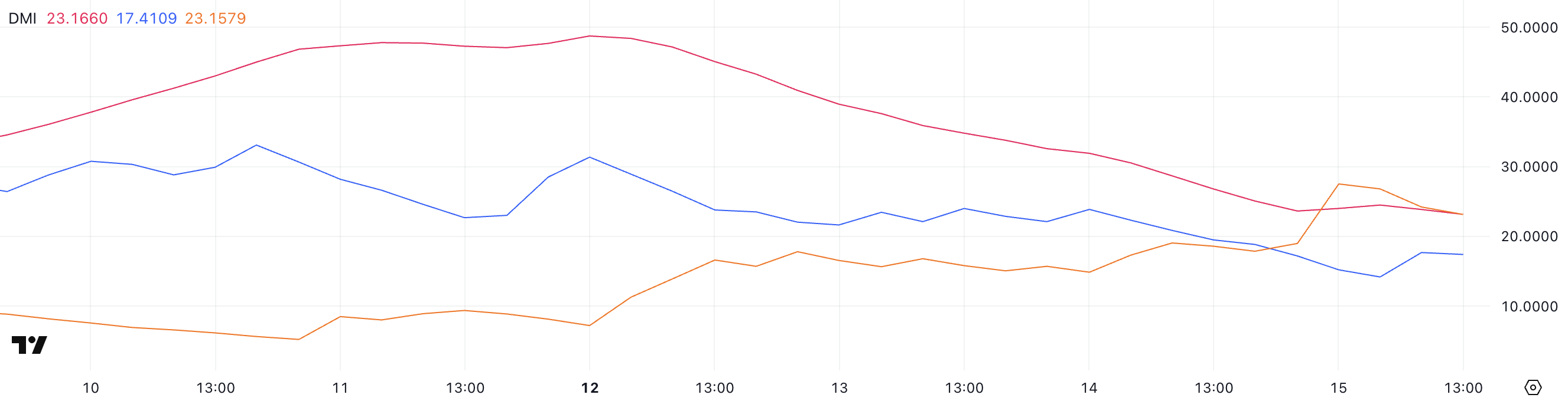 한편, +DI(양의 방향성 지표)는 23.87에서 17.41로 하락하여 상승 압력이 감소했음을 나타냅니다. 동시에 -DI(음의 방향성 지표)는 17.86에서 23.15로 상승하여 하락 모멘텀이 통제력을 얻고 있음을 보여줍니다.