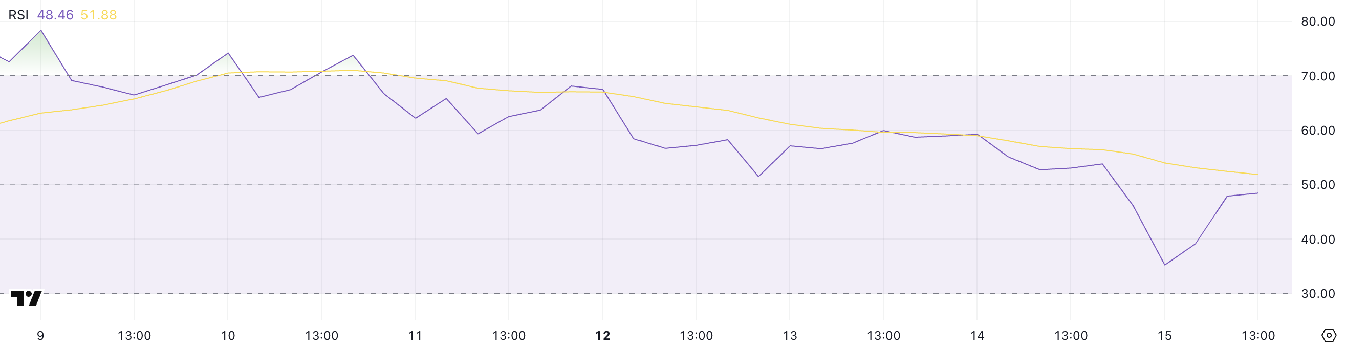 TAO의 RSI(상대 강도 지수)는 현재 48.46에 있으며, 어제 53.82에서 몇 시간 전 35.25까지 급락했습니다.
