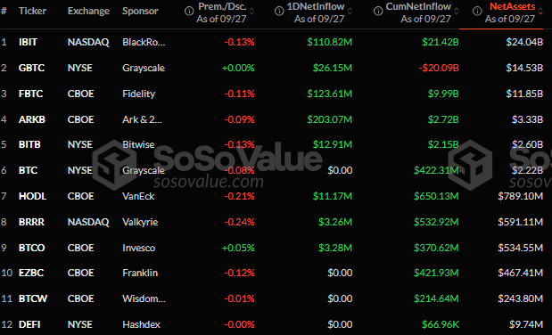 회사가 비트코인을 적극적으로 매입하는 동안, 그들의 주력 IBIT 비트코인 ETF(상장지수펀드)는 현물 BTC ETF 시장의 선두에 있습니다. 9월 27일 기준으로 누적 순 유입액이 214억 2000만 달러에 이릅니다. 이는 피델리티의 FBTC가 99억 9000만 달러로 뒤따릅니다. 블랙록을 포함한 나머지 발행자들은 이 금융 도구를 통해 기관 투자자들에게 비트코인에 간접적으로 노출됩니다.