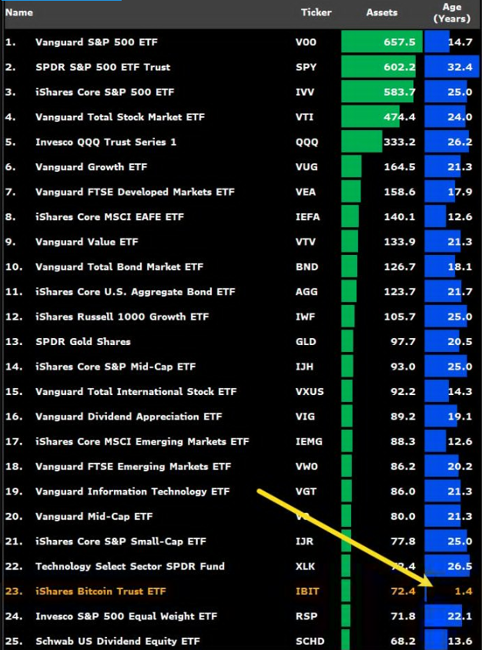 이 속도가 유지된다면, IBIT는 2026년 5월까지 사토시를 추월할 예정입니다. 이는 출시 후 2년 만에 이루어지는 것입니다. 이 빠른 성장은 IBIT를 자산 관리 규모로 세계 25대 ETF 중 가장 어린 멤버로 만듭니다. 나이는 단 1.4년입니다.