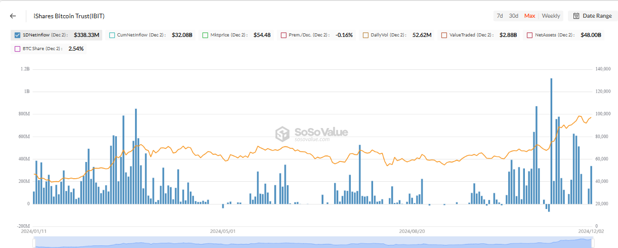 Sponsored이 금융 상품은 월요일에 3억4000만 달러에 가까운 유입을 기록했습니다. 12월 2일 기준 누적 순 유입은 320억 8000만 달러였으며, 피델리티의 FBTC는 114억8000만 달러로 뒤를 이었습니다.