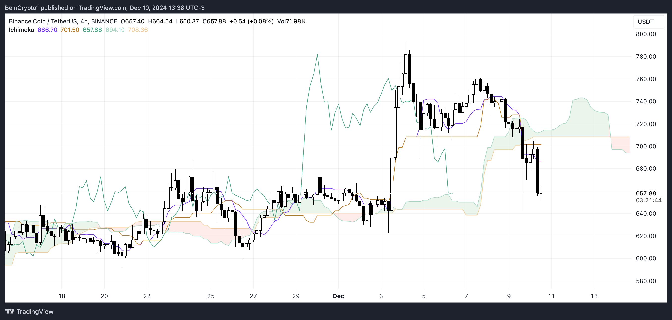 BNB 가격은 현재 이치모쿠 클라우드 아래에 있어 하락 국면에 있음을 시사합니다. 클라우드의 녹색 영역이 얇아지고 모멘텀을 잃고 있으며, 선행 스팬 라인은 평평해 보입니다.