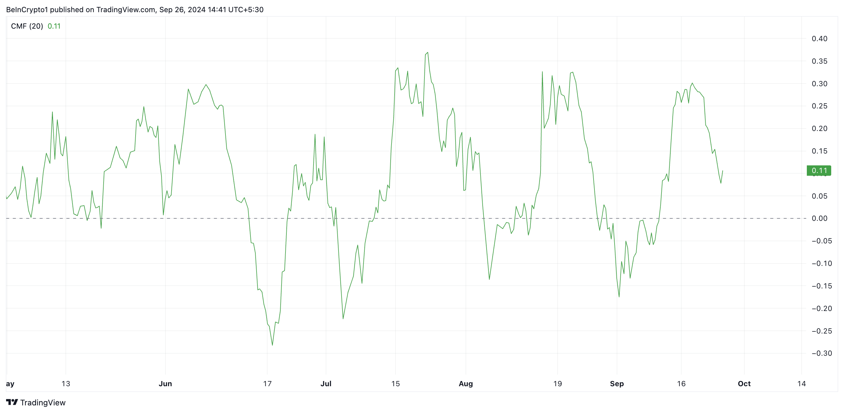 9월 21일 이후로 BNB의 차이킨 머니 플로우(CMF)는 지속적으로 감소하고 있습니다. 현재 BNB의 CMF는 0.12로 하락 추세에 있습니다.