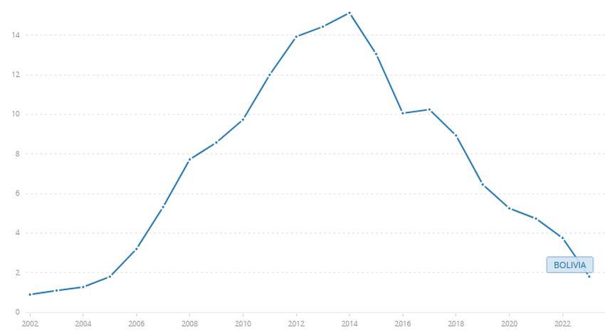 볼리비아의 금과 미국 달러를 포함한 총 외환보유액은 지난 10년 동안 지속적으로 감소했습니다. 세계은행에 따르면 2006~2007년에 가까운 가치로 회복되었다고 합니다.