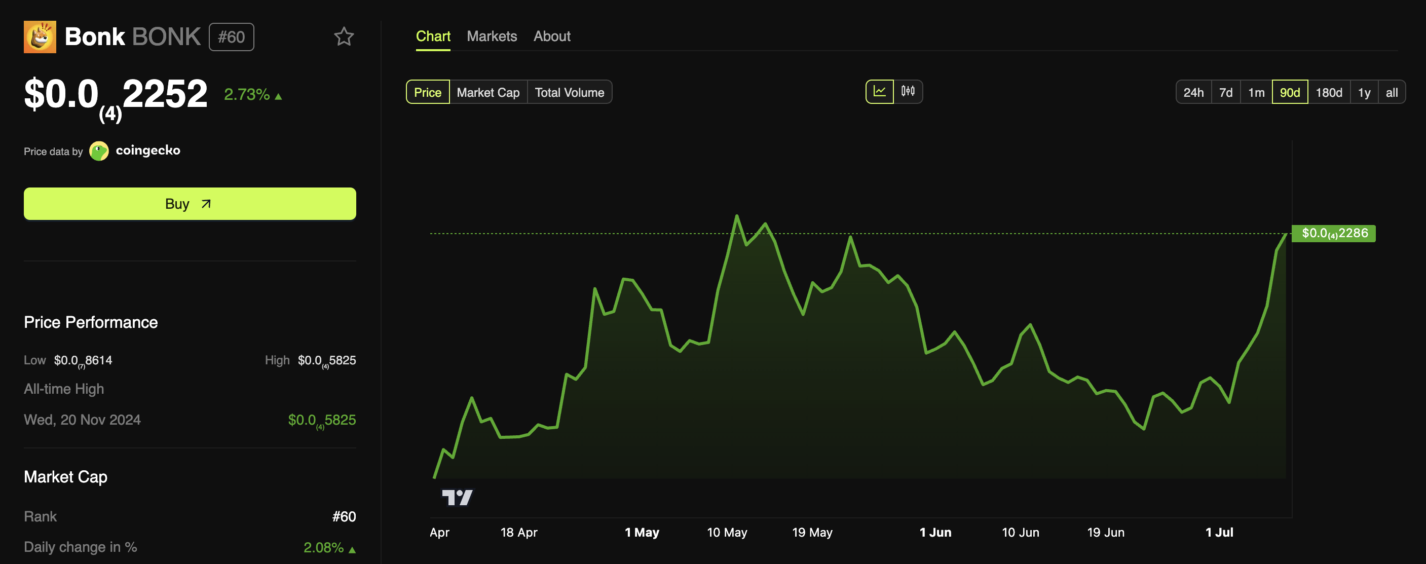 이로 인해 상승 모멘텀이 강화되었고, BONK의 차트는 녹색으로 물들었습니다. 작성 시점에서 밈코인은 0.0000225달러에 거래되고 있으며, 지난 하루 동안 2.7% 상승했습니다.