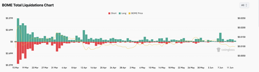 Sponsored Sponsored지난 주 BOME의 가격 하락으로 인해 많은 매수 포지션이 청산되었습니다. 참고로 6월 7일 매수 포지션 청산 금액은 총 206만 달러로 4월 12일 이후 최고치를 기록했습니다.