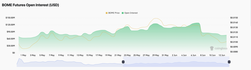 BOME의 가격은 6월 6일 0.013달러로 정점을 찍었고 이후 하락세를 보이고 있습니다. 하락 추세는 같은 날 하락하기 시작한 선물 미청산 계약의 하락과 일치합니다.