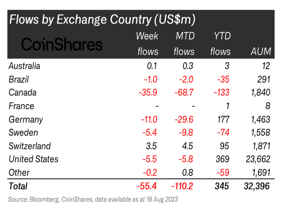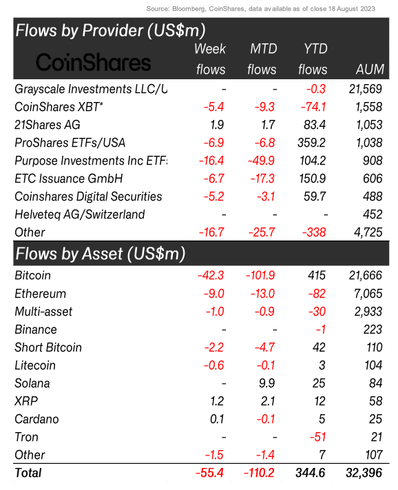 코인셰어스는 주간 보고서를 통해 디지털자산 펀드에서 자금 총 5500만 달러가 유출됐다고 21일(현지시각) 발표했다.