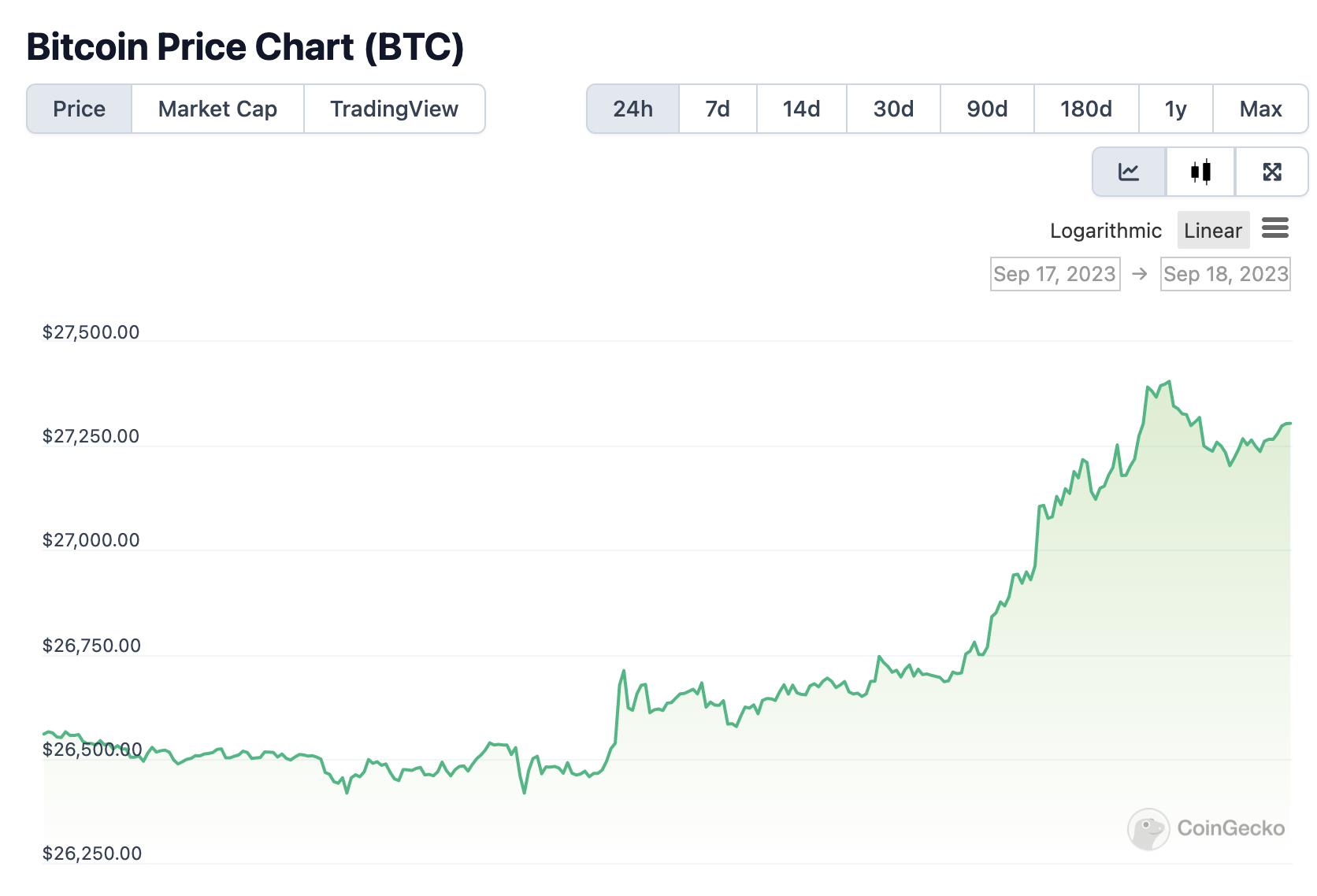 18일(현지시각) 비트코인 가격이 3% 이상 상승하며 이달 들어 처음으로 2만 7000달러를 돌파했다.