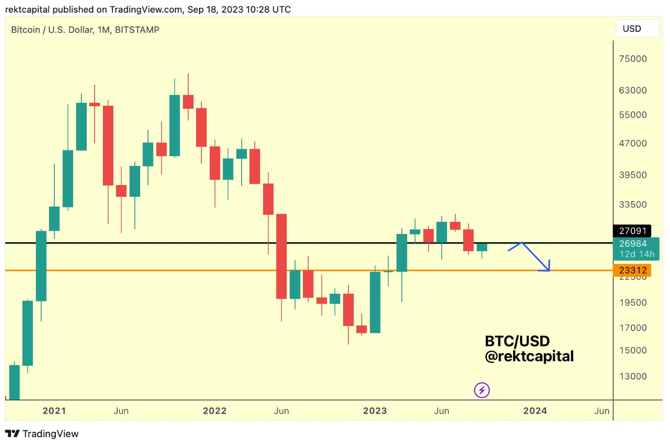 또 다른 분석가인 렉 캐피털(@rektcapital)은 비트코인 가격이 더 높은 수준에 도달하고, 9월 종가까지 가져가야 의미가 있다고 주장했다. 그는 “비트코인은 곧 2만 7100달러로 돌아갈 것이며, 이는 올해 초 지지선이었다”고 말했다. 이어 “이 가격이 월말 종가로 형성된다면, 이는 새로운 가격 지지선이 될 것”이라고 분석했다.