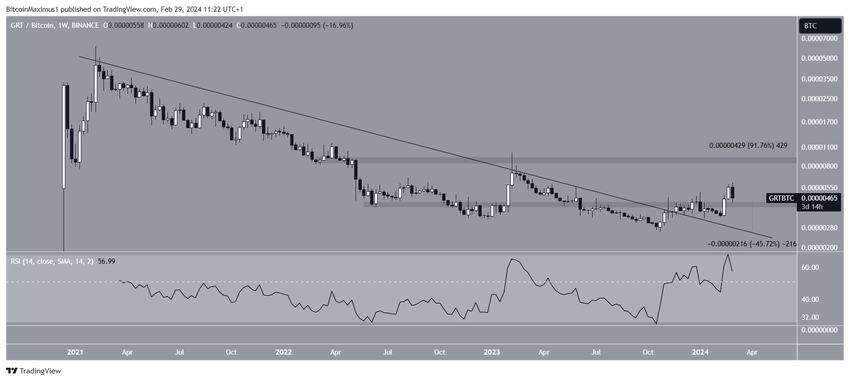 BTC를 능가할 수 있는 마지막 알트코인은 GRT입니다. GRT 가격은 사상 최고치 이후 존재했던 하강 저항 추세선을 돌파했습니다. 추세선(녹색 아이콘)에서 반등 후 GRT는 상승 움직임을 시작하여 450 사토시 저항 영역을 돌파했습니다.
