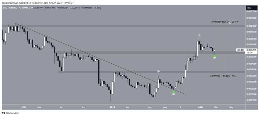 주간 시간대 전망에 따르면 SOL은 2023년 9월 장기 하강 저항 추세선을 돌파하고 지지선(녹색 아이콘)으로 확인된 이후 빠르게 상승 했습니다. 이러한 상승으로 2023년 12월에는 ₿0.0029로 최고치를 기록했습니다. SOL은 고점 이후 소폭 하락했지만 이번 주에 0.0020파운드 수평 영역에서 반등했습니다.