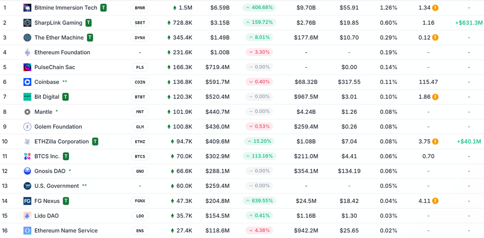 8월 17일 기준, BitMine은 1,523,373 ETH를 보유하고 있으며, 토큰당 4,326달러의 가치를 지니고 있으며, 192 비트코인을 보유하고 있습니다. 이 확장은 BitMine을 세계 최대 이더리움 재무로 만들었으며, MicroStrategy (MSTR)에 이어 두 번째로 큰 암호화폐 재무로 자리 잡았습니다. MicroStrategy는 629,376 BTC를 보유하고 있으며, 현재 726억 4천만 달러의 가치를 지니고 있습니다.