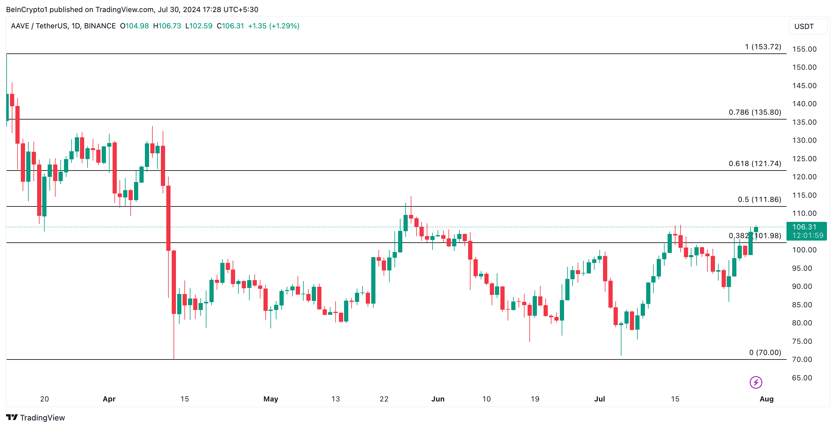 대표적인 대출 프로토콜 에이브의 거버넌스 토큰인 에이브의 가격도 지난 7일 동안 두 자릿수 급등했습니다. 보도 시점에 105.62달러에 거래되고 있는 이 토큰의 가격은 같은 기간 동안 11% 상승했습니다.