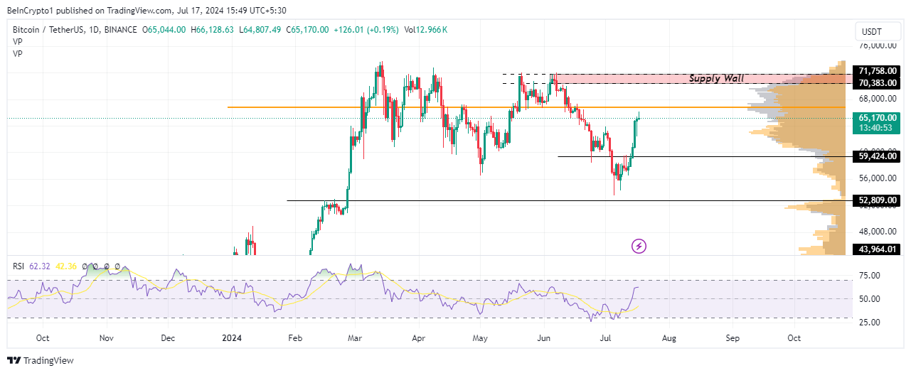 따라서 캔들스틱이 공급 벽의 상단 밴드인 71,758달러 위에서 마감되어야만 추가 상승을 확인할 수 있습니다. 이 약세 주문 블록을 돌파하면 사상 최고치를 경신할 수 있습니다.