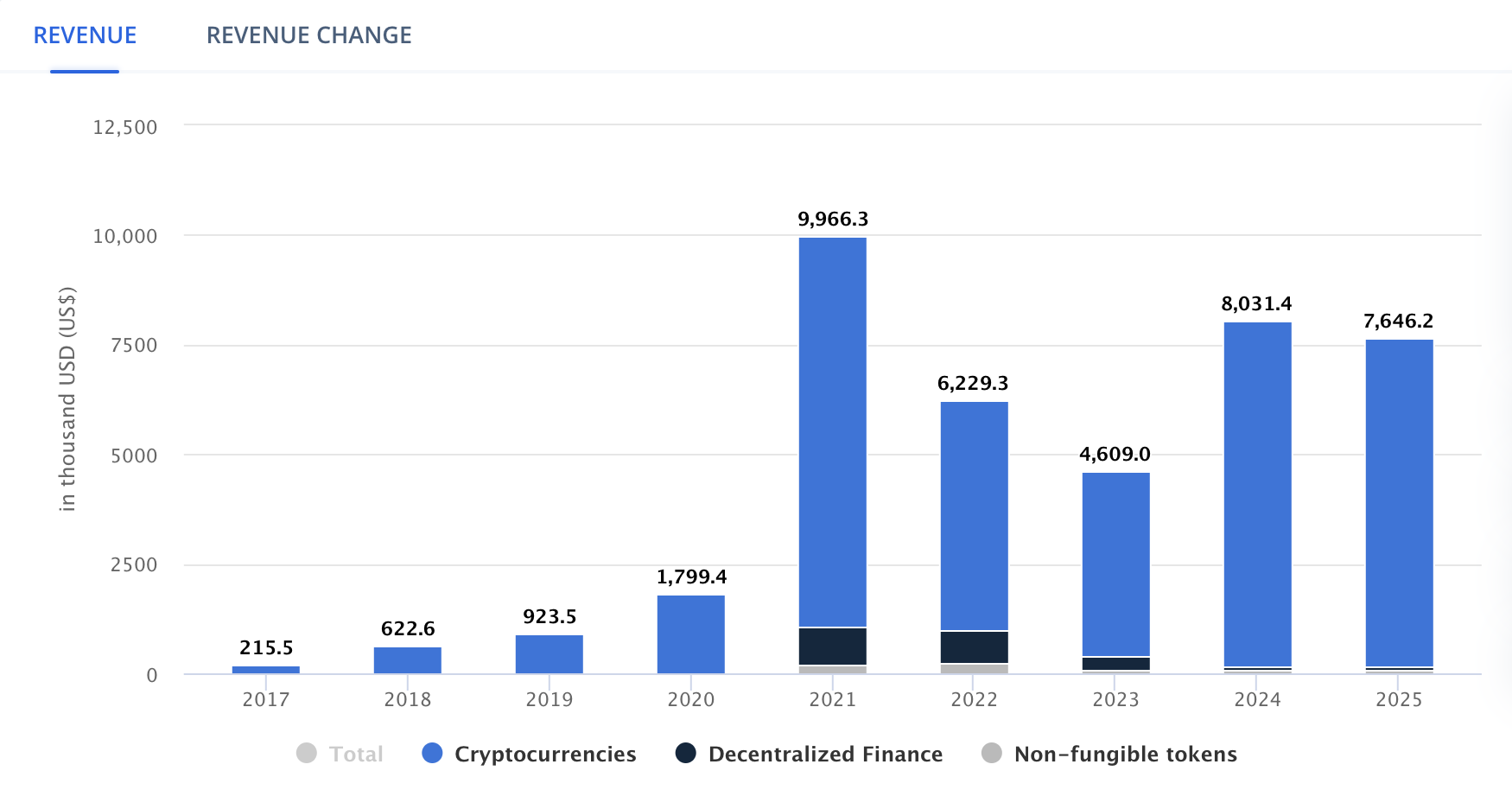 거래소에 대한 단속에도 불구하고, 캄보디아는 여전히 글로벌 암호화폐 분야에서 중요한 역할을 하고 있습니다. 캄보디아는 1인당 소매 암호화폐 사용량에서 상위 20위 안에 들며, 거래의 70%가 중앙화 거래소를 통해 이루어집니다. Statista는 캄보디아의 디지털 자산 시장이 2024년에 800만 달러의 수익을 창출할 것으로 예상하지만, 2025년에는 성장세가 둔화될 수 있습니다.