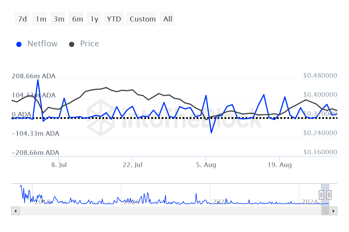또한, 고래들은 지난 한 달 동안 ADA를 축적하는 데 집중하고 있으며, 이는 토큰의 미래에 대한 신뢰를 나타냅니다. 순유입이 대체로 긍정적이어서 대형 지갑 소유자들이 ADA 가격 상승을 기대하고 있습니다.