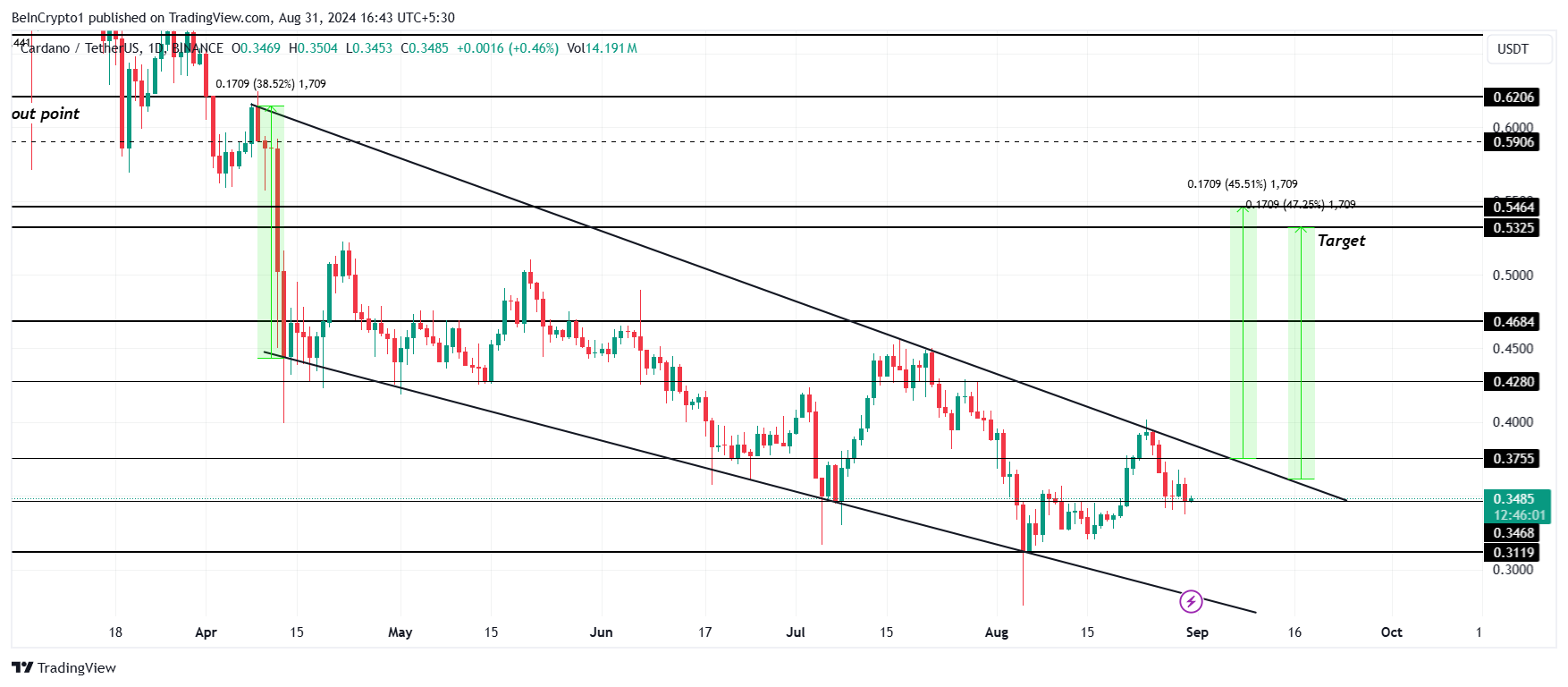체인지 하드 포크는 강세 하락 웨지 패턴에서 성공적으로 벗어날 경우 카르다노의 가격을 크게 상승시킬 수 있습니다. 이 패턴은 알트코인에 대해 45% 상승을 제안하며, 목표 가격은 0.54달러입니다.