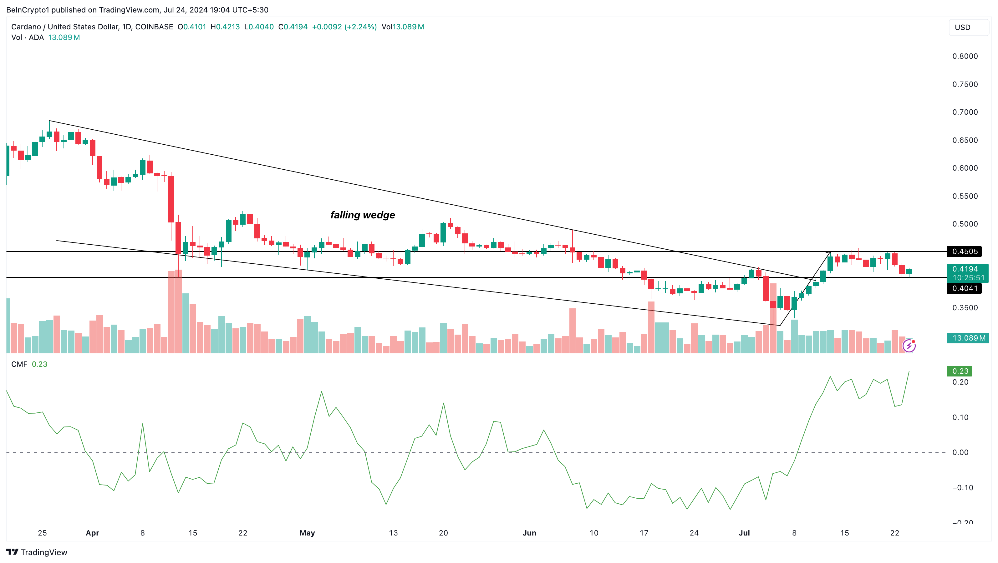 분석에 따르면 이 패턴은 7월 6일 ADA가 0.45달러로 다시 상승하면서 발생했습니다. 최근 가격은 0.40달러에서 0.45달러 사이의 박스권에서 움직이고 있습니다.