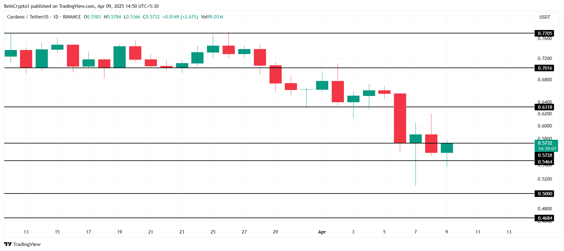 현재 카르다노의 가격은 0.57달러에 머물러 있으며, 중요한 0.54달러 지지선 위에 있습니다. 그러나 이 지지선은 ADA가 0.50달러 아래로 떨어지기 전의 마지막 방어선입니다. 가격이 하락세를 계속하면, 0.50달러로의 하락이 현실적인 가능성이 됩니다.