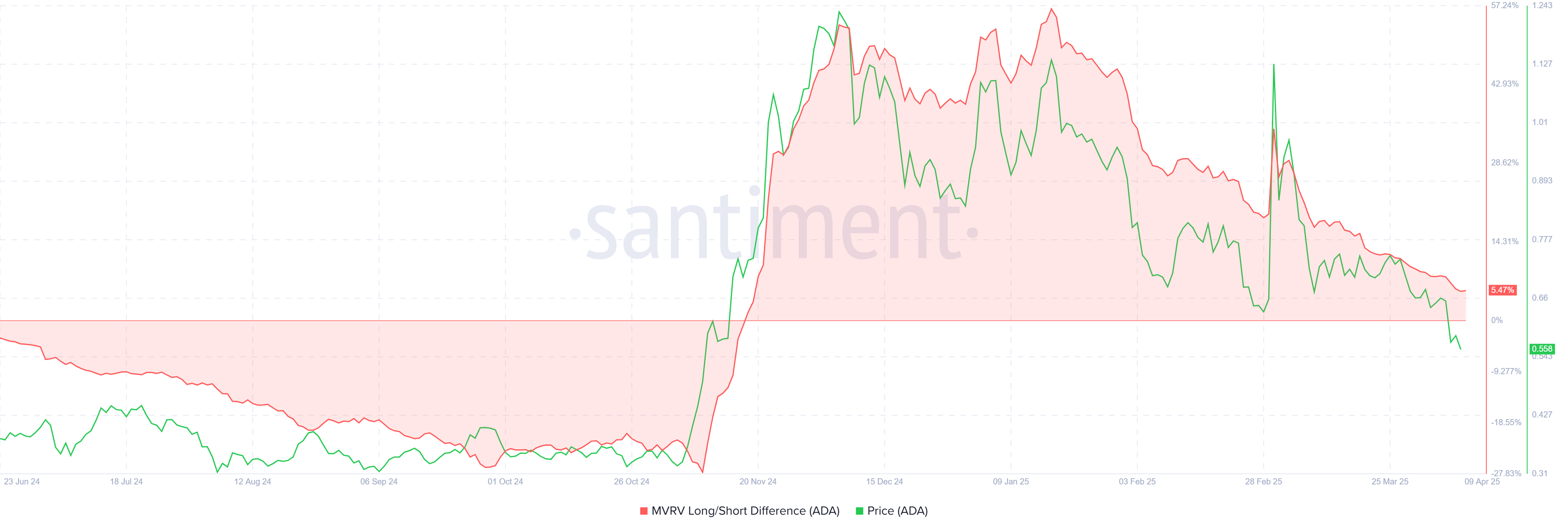 MVRV 장단기 차이가 0선 아래로 계속 하락하면, ADA 회복에 대한 투자자들의 믿음이 약해지고 있음을 나타냅니다. LTH가 잠재적으로 이익을 잃게 되면, 그들이 포지션을 유지할 동기가 거의 없어져 추가 가격 하락으로 이어질 수 있습니다.
