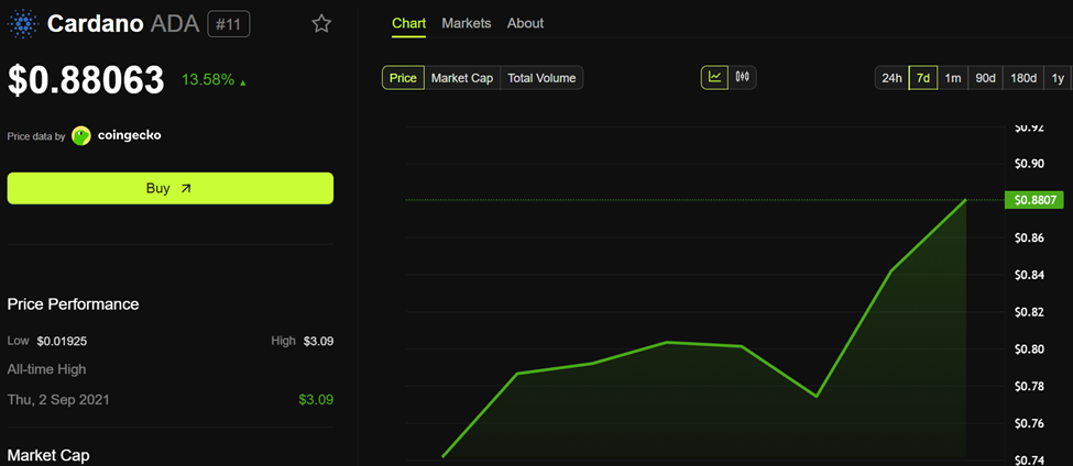 이 글을 쓰는 시점에서 ADA는 0.88063달러에 거래되고 있으며, 지난 24시간 동안 거의 15% 상승했습니다.