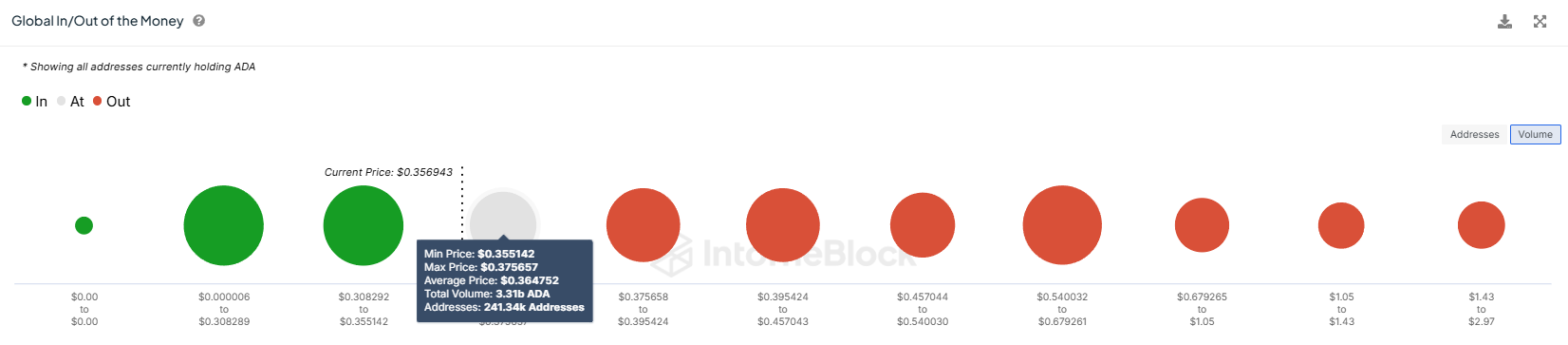 최근 카르다노의 가격 하락으로 인해 약 33억 1000만 ADA 토큰이 수익성을 잃었습니다. 글로벌 인/아웃 오브 더 머니(GIOM) 지표에 따르면, 이 공급은 카르다노가 0.35달러에서 0.37달러 사이에서 거래될 때 취득되었으며, 현재 수익성이 없는 상태입니다. 그러나 ADA가 0.37달러 이상으로 회복되면 수익성을 회복할 수 있습니다.