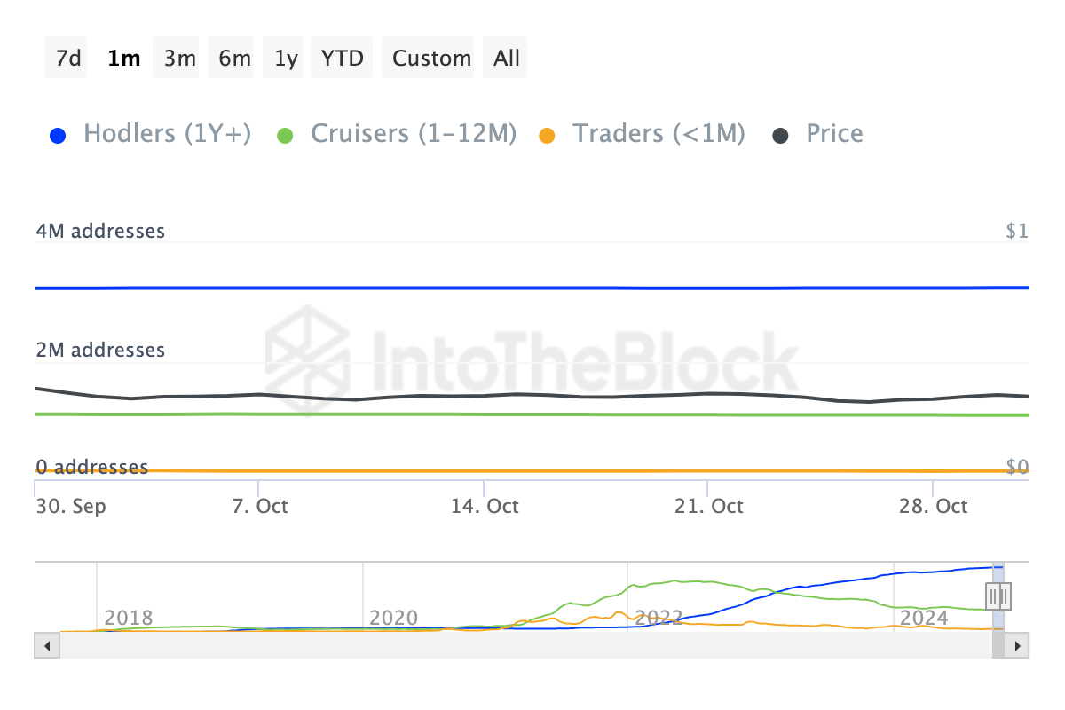 특히, 투자자들이 토큰을 보유한 기간을 나타내는 Balance by Time Held 지표는 최근 30일에서 12개월 사이에 ADA를 취득한 사람들이 판매하고 있음을 밝힙니다. 이 추세가 계속된다면, ADA의 가격은 상당한 하락 압력에 직면할 수 있습니다.
