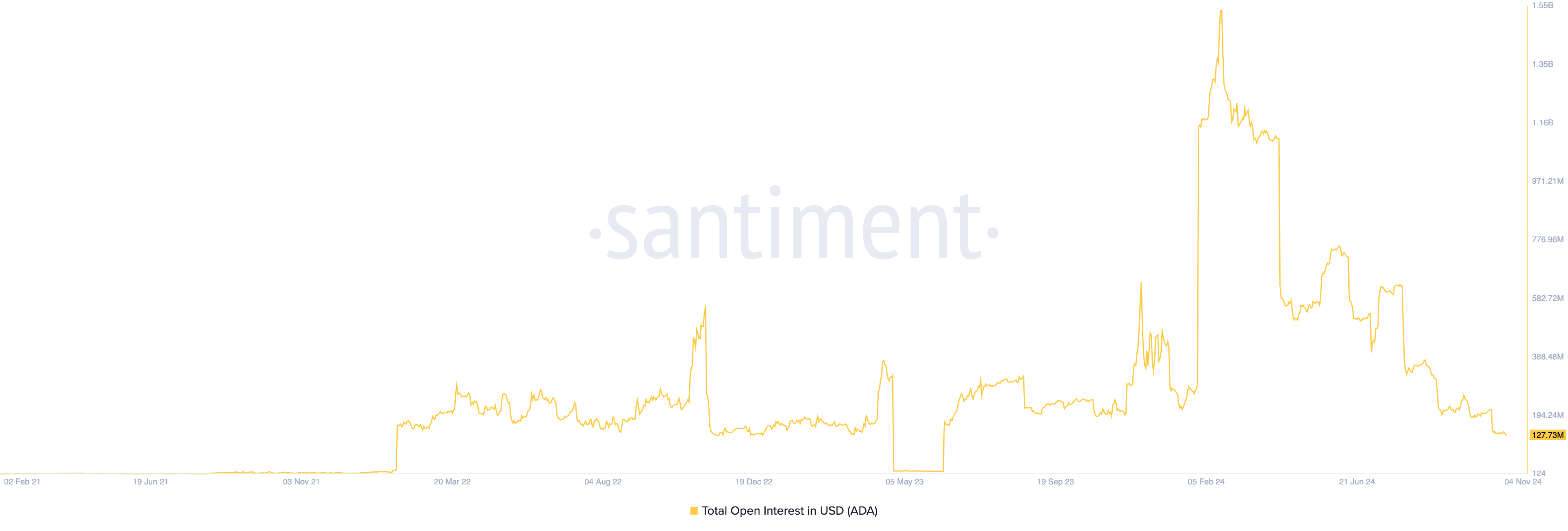 카르다노의 횡보하는 가격 움직임은 미결제 약정이 크게 감소하면서 동반되었습니다. 이는 아직 정산되거나 청산되지 않은 파생상품 계약의 총 수를 측정합니다. 현재 이는 1억 2800만 달러로, 8월 초 이후 80% 급락했습니다. 현재 ADA의 미결제 약정은 2023년 5월 이후 가장 낮은 수준입니다.