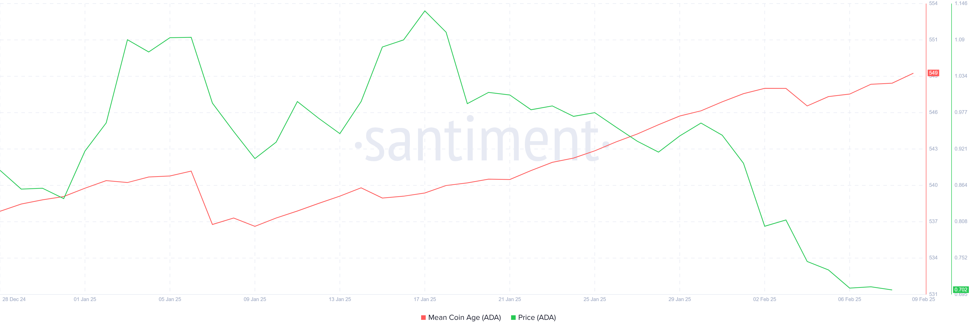 계속되는 하락에도 불구하고, 카르다노의 평균 코인 연령은 연초부터 증가하고 있습니다. 이 지표는 코인이 이동하지 않고 지갑에 얼마나 오래 머무는지를 추적합니다.