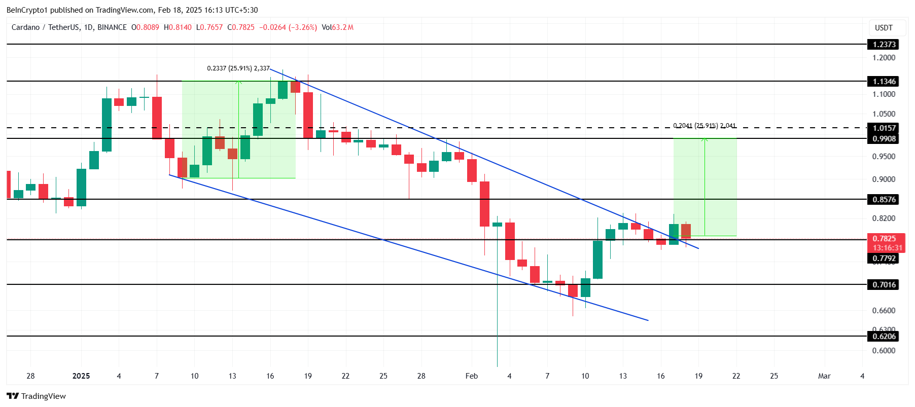 카르다노의 가격은 현재 하락 쐐기 패턴에서 돌파하고 있습니다. 이는 종종 26% 상승하여 0.99달러에 도달하는 것과 관련이 있습니다. 잠재적인 가격 움직임은 강력한 투자자 지원이 필요하며, ADA는 이 목표를 달성하기 위한 지원을 받고 있는 것으로 보입니다. 긍정적인 투자자 심리가 지속되는 한, ADA는 다음 상승을 준비할 수 있습니다.