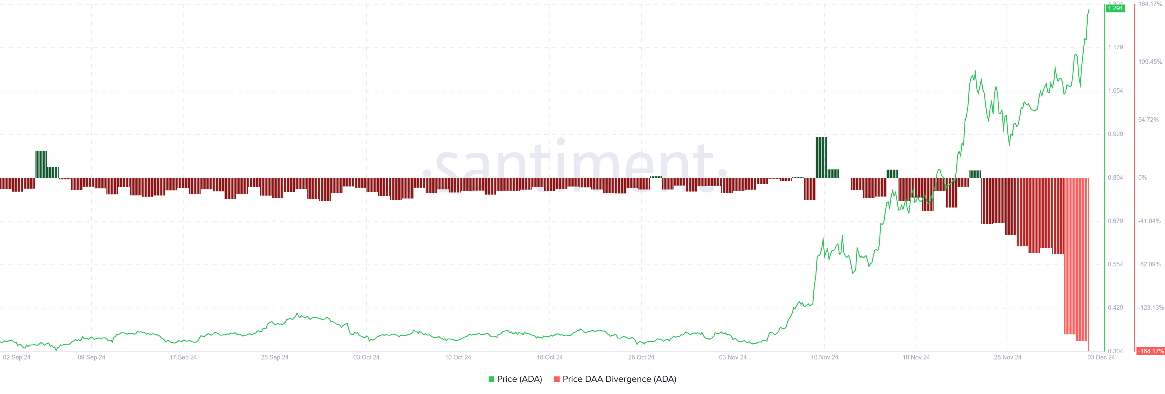 카르다노의 전체 거시적 모멘텀은 조금 더 복잡합니다. 가격 DAA 다이버전스 지표는 ADA의 가격이 상승하는 동안 시장 참여가 같은 비율로 증가하지 않고 있음을 보여줍니다. 이 다이버전스는 종종 약세 신호로 간주되며, 이는 랠리가 유기적인 관심과 지속적인 유입보다는 투기적 매수에 의해 주도될 수 있음을 시사합니다.