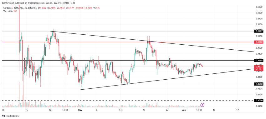 이 패턴은 일반적으로 가격이 기존 추세 방향으로 돌파하기 전에 바닥을 다지는 기간을 나타냅니다. 결과는 강세일 가능성이 높지만, 이는 상당한 움직임이 있기 전에 추가적인 횡보세를 보일 수 있습니다. 이를 위해서는 먼저 ADA가 $0.46을 지지선으로 확보해야 합니다.
