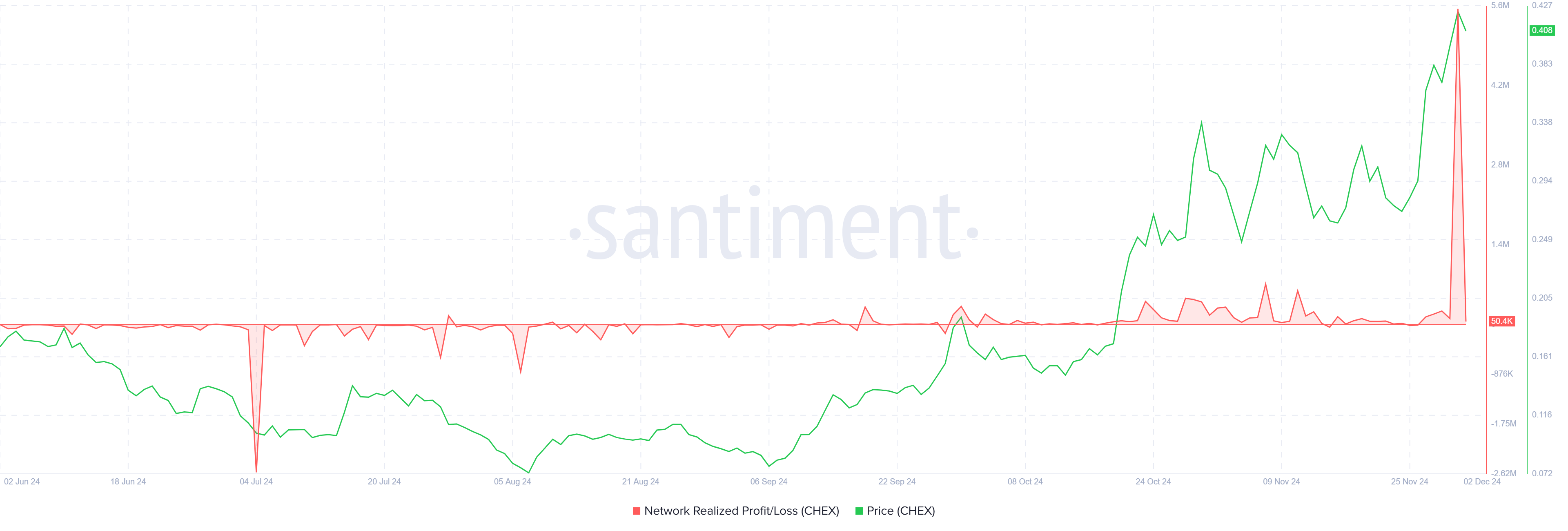 CHEX가 새로운 ATH에 도달하면서 이익 실현이 역사상 최고 수준으로 급증했습니다. 많은 투자자들이 최근의 랠리에서 이익을 확보하기 위해 보유 자산을 매도했습니다. 이러한 매도 급증은 단기 가격 하락에 대한 우려를 불러일으키지만, 이익 실현이 둔화되면 상황이 안정될 수 있습니다.