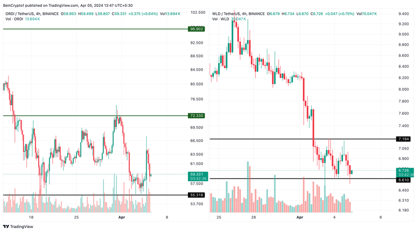 반대로 WLD는 3월 말 이후 가치가 약 30% 하락하며 약세 추세에 직면했습니다. 현재는 6.61달러 지지선 부근에서 움직이고 있습니다.
