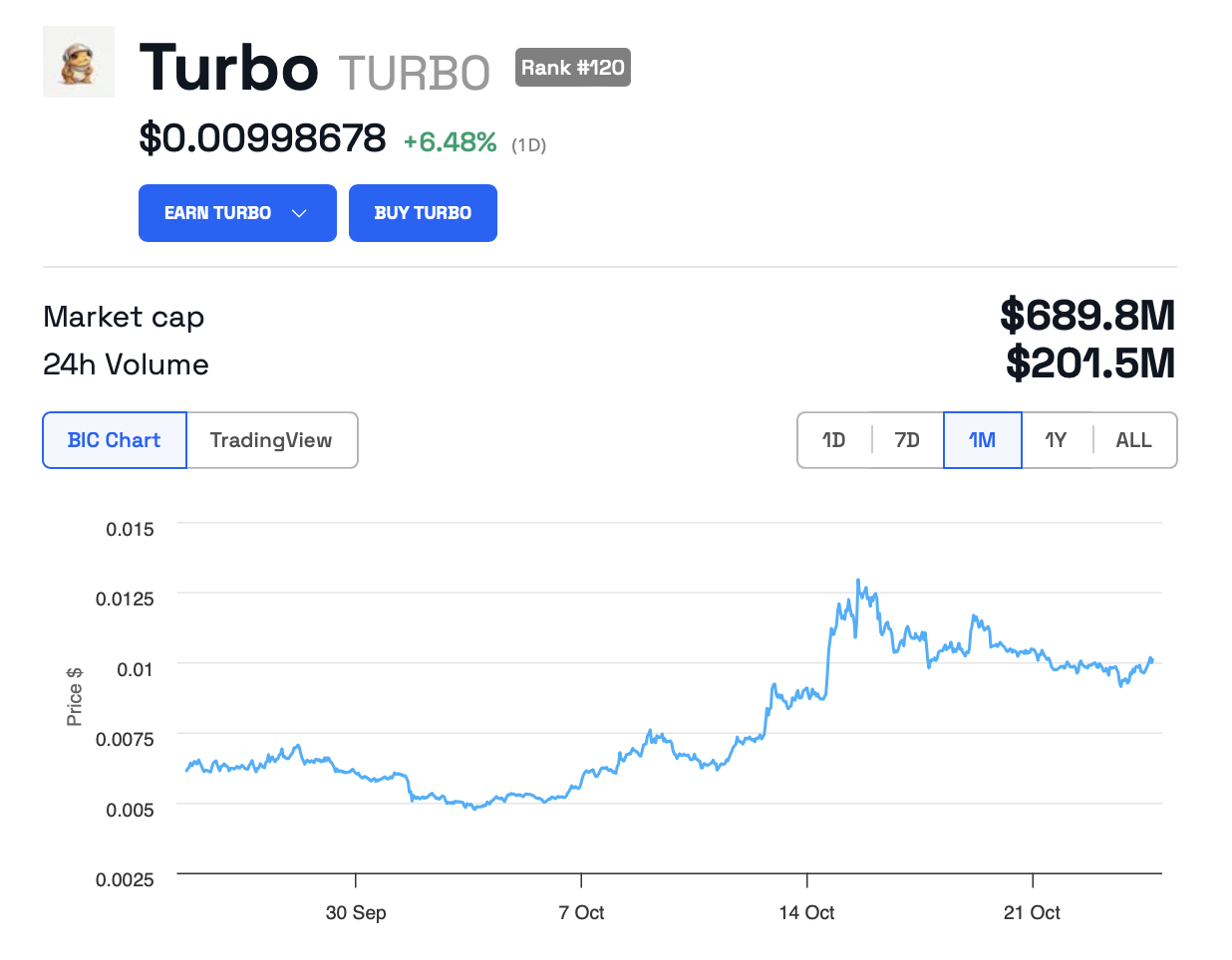 이 상승에도 불구하고 터보의 가격은 10월 중순에 정점을 찍은 이후 하락했습니다. 코인베이스의 발표 후 가치가 급등했지만 최근 일주일 동안의 하락이 이전의 상승을 덮었습니다.