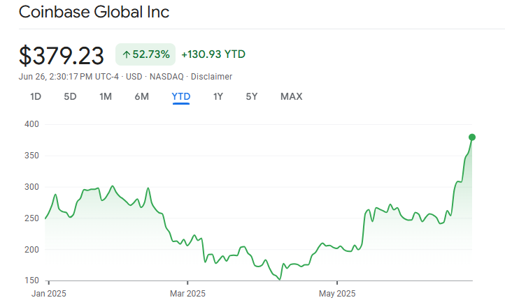코인베이스 주식은 6월 26일 수요일에 사상 최고치를 기록했습니다. COIN은 시장 마감 전 주당 380달러에 거래되었습니다. 주식은 올해 들어 거의 53% 상승했습니다.