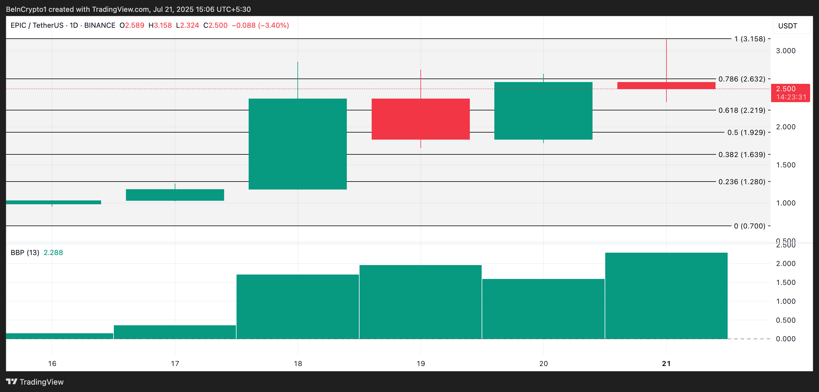 EPIC은 지난 주 155% 상승하여 현재 2.50달러에 거래되고 있습니다. 일일 차트에서 이 알트코인의 엘더-레이 지수는 지난 4일 동안 꾸준히 두드러진 히스토그램 막대를 나타내며 시장 참여자들의 강한 매집을 보여줍니다.