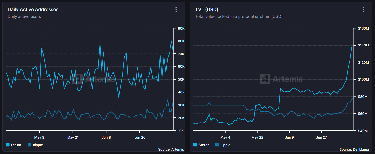 일부 투자자들은 XLM이 XRP를 능가할 수 있다고 주장합니다. 이는 일일 활성 주소와 총예치량(TVL)과 같은 특정 온체인 데이터 포인트를 비교할 때 합리적으로 보입니다. 예를 들어, 7월 초 이후 XLM은 100% 급등한 반면, XRP는 35% 상승했습니다.