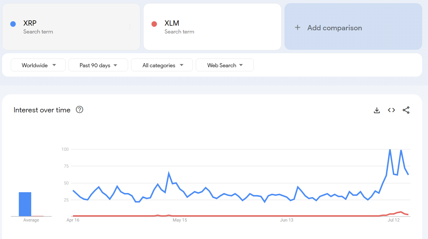 그러나 구글 트렌드를 사용하여 인기를 조사할 때, XLM은 XRP에 비해 상당히 뒤처져 있음을 알 수 있습니다. 이 추세는 소매 투자자들의 관심 수준을 나타냅니다.