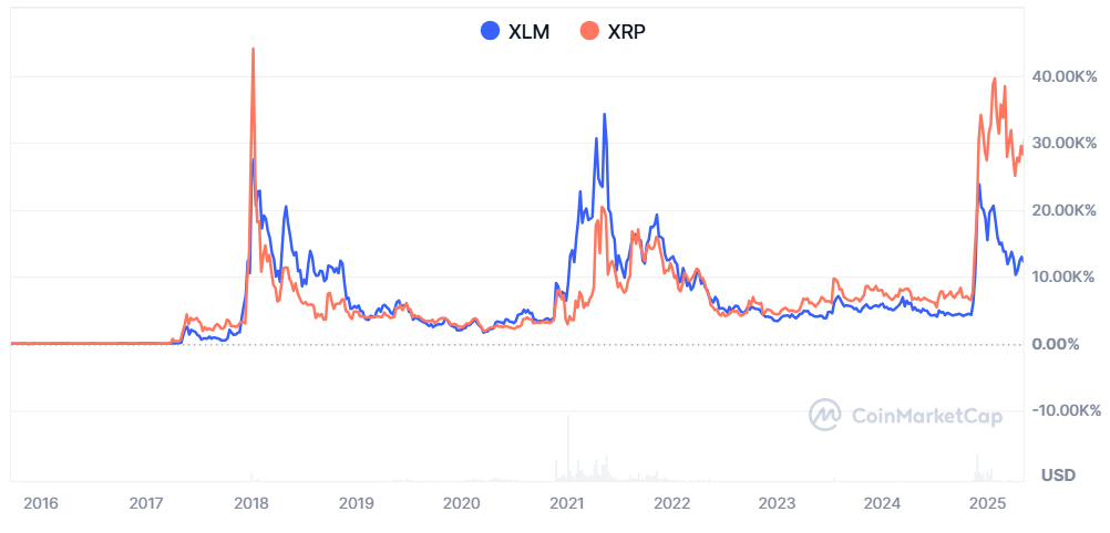 지난 10년 동안, 리플의 XRP와 스텔라의 XLM은 이상하게도 지속적인 가격 상관관계를 보여왔습니다. XRP는 종종 더 많은 헤드라인을 장식하지만, XLM의 가격 성과는 이에 뒤지지 않았습니다.