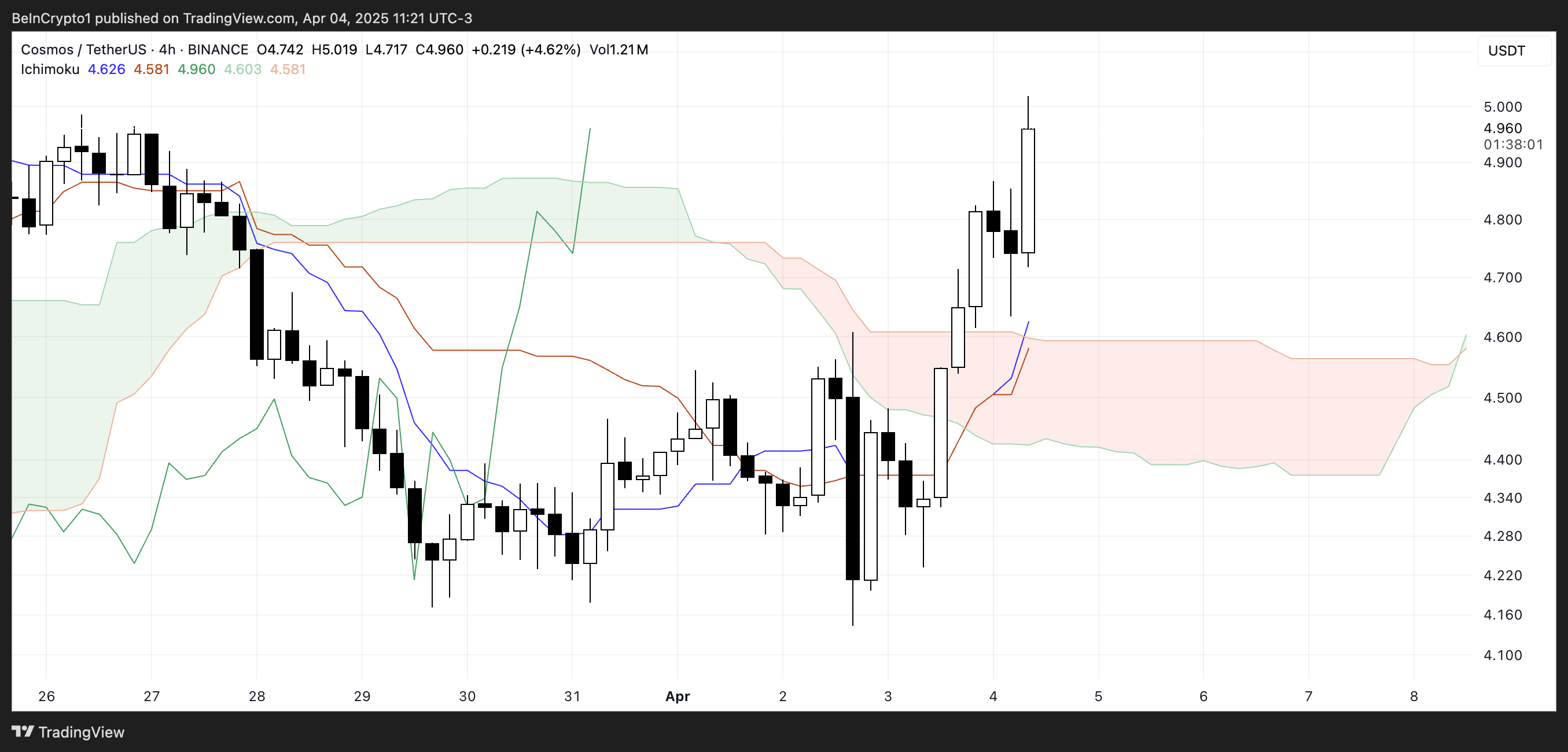 코스모스는 일목균형표 차트에서 상승 돌파를 보이고 있습니다. 가격이 구름 위로 결정적으로 이동하여 잠재적인 추세 반전을 나타냅니다.