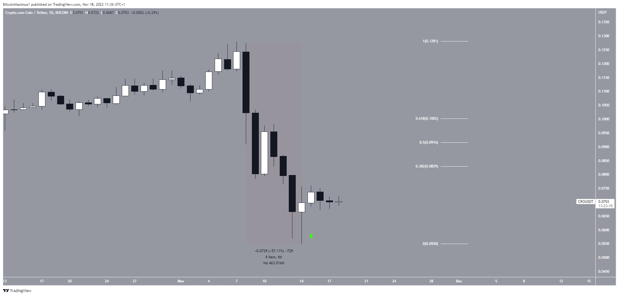 CRO 가격은 지난 8일부터 급락하기 시작하여 14일에는 0.05달러까지 6일 만에 57% 하락했다. CRO는 그 후 아래 꼬리가 달린 캔들을 생성했다(녹색 아이콘). 그러나 아직 가격 랠리가 시작되지 않았다.