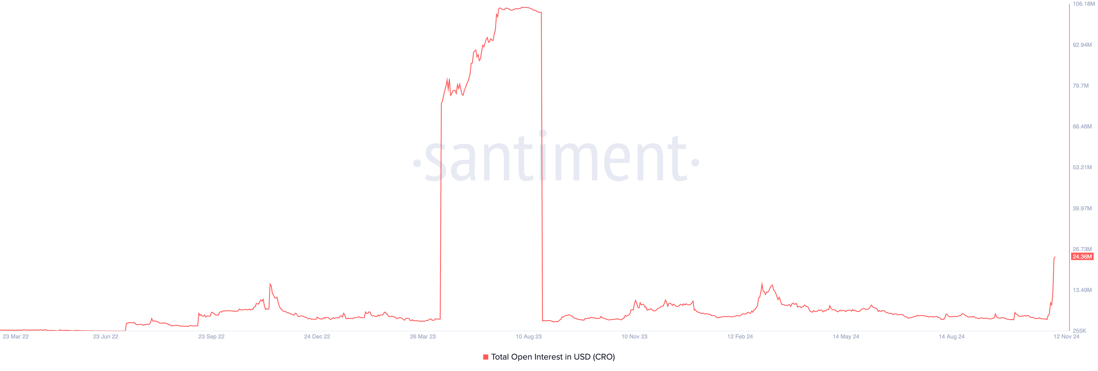 특히, 증가하는 미결제 약정은 CRO 거래 활동의 급증을 확인시켜 줍니다. 현재 이는 2436만 달러에 달하며, 2023년 8월 이후 최고치입니다.